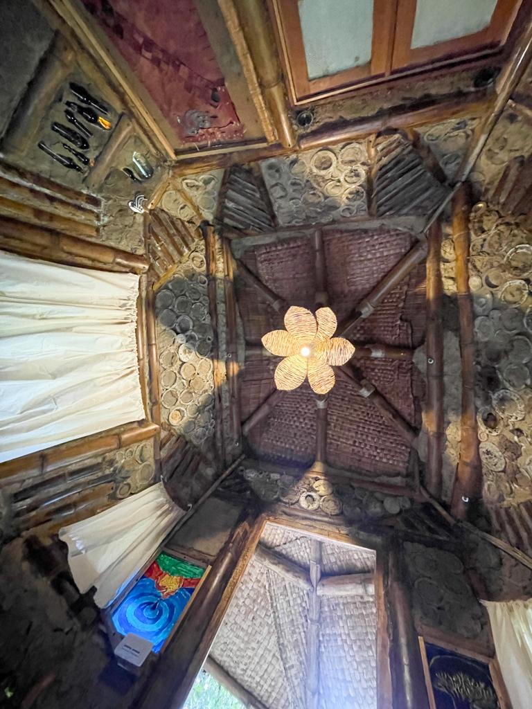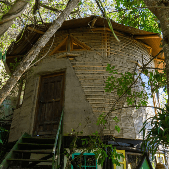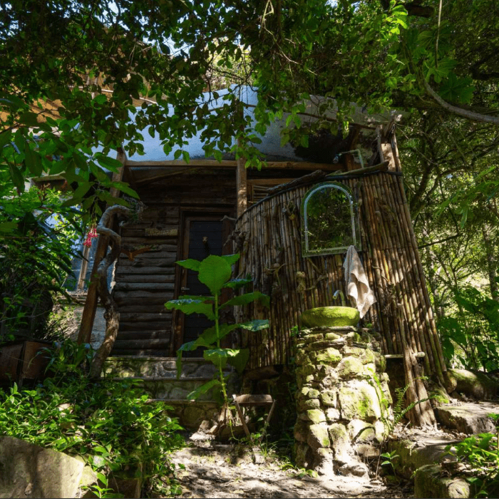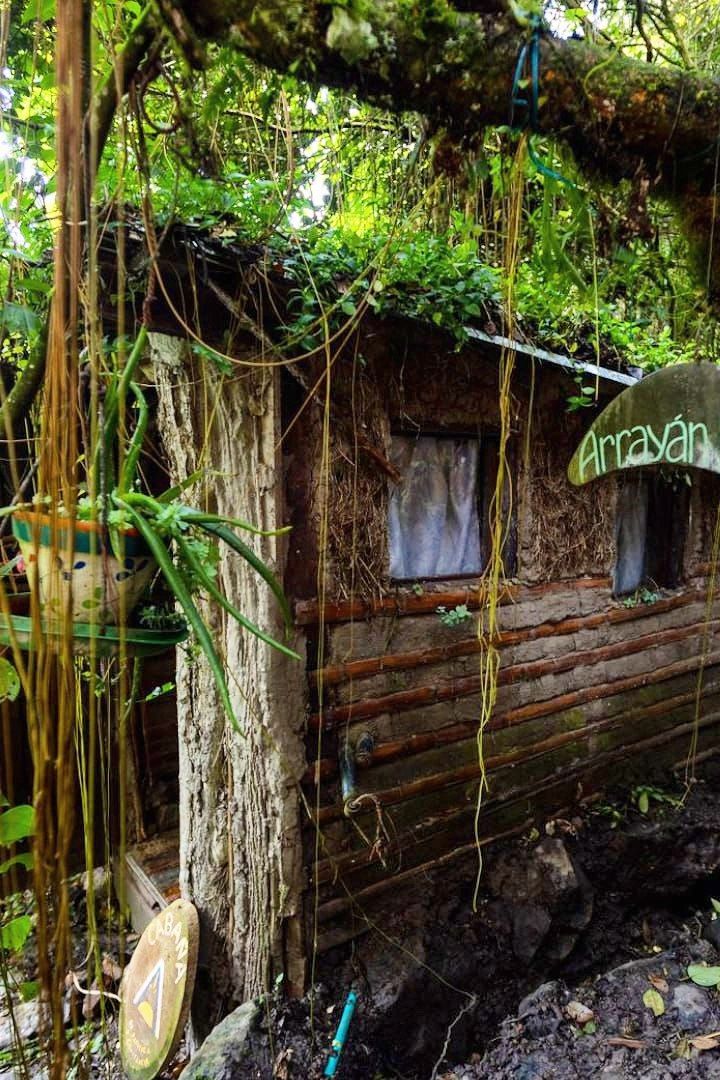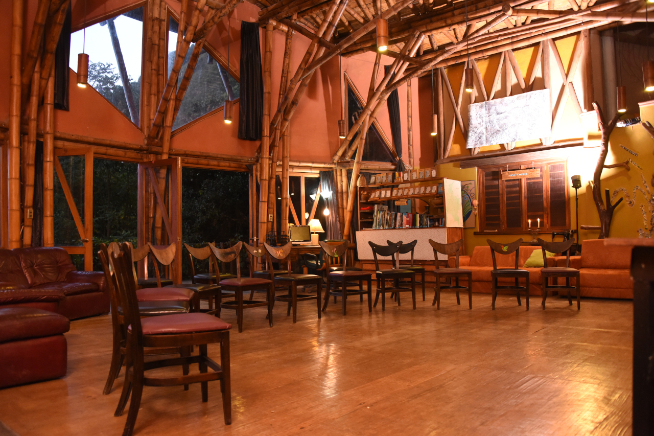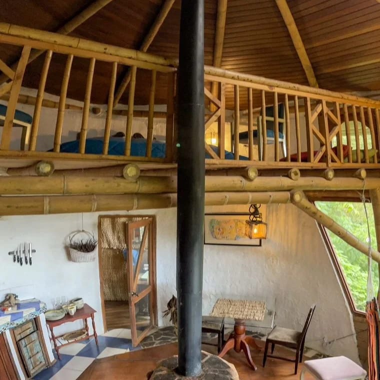 Dormir con el arrullo de una quebrada es una terapia extraordinaria y despertarse metiéndose en la quebrada mejora el sistema inmunológico. Mama Yaku o Madre Agua, esta construida en bareque y guadua. Su estructura octagonal en forma de hongo sostiene un techo verde.