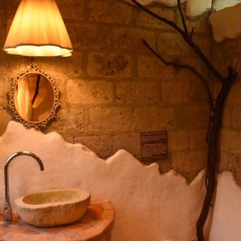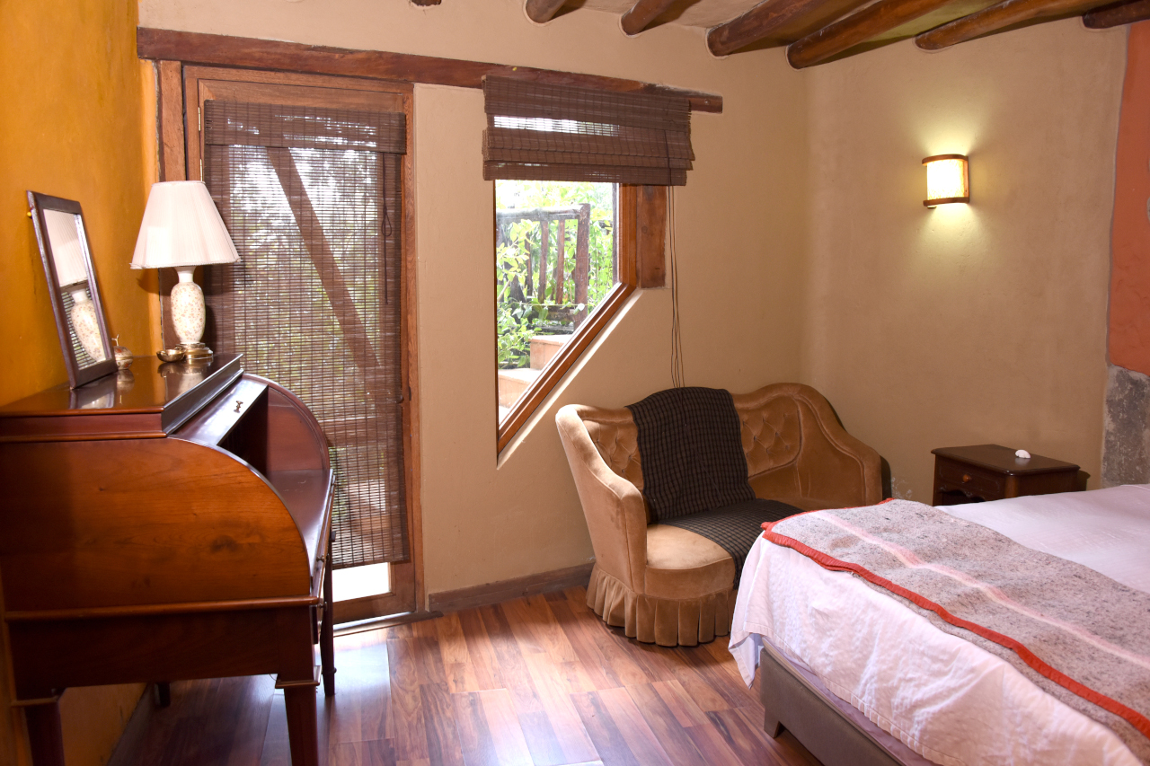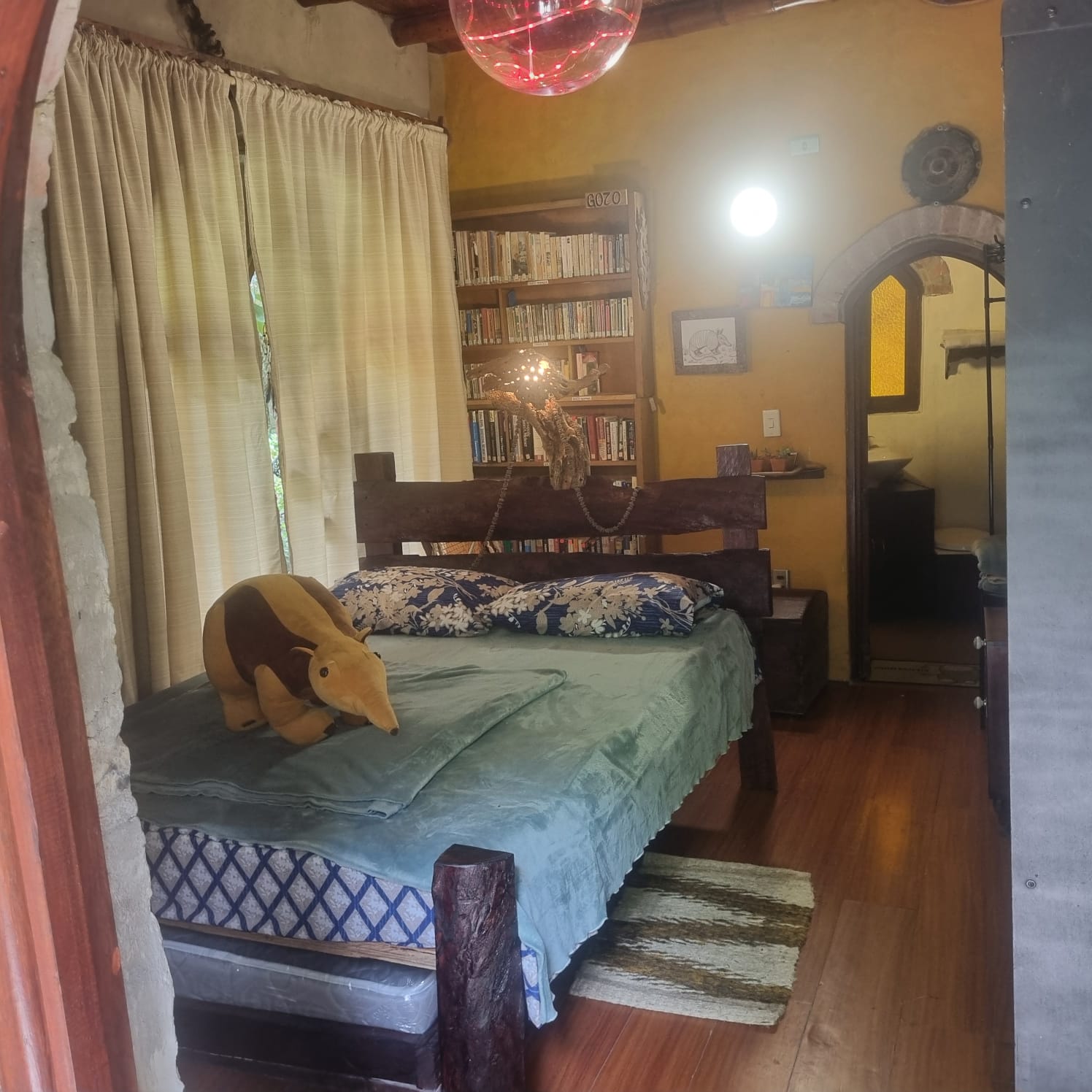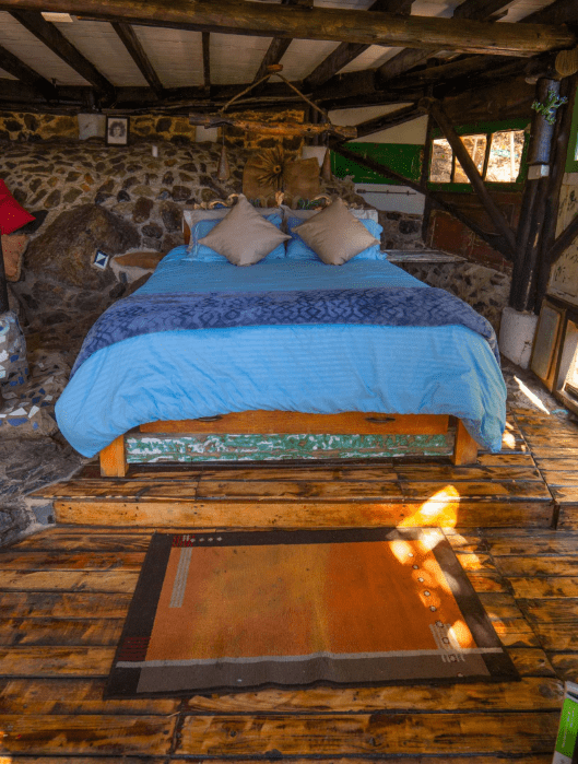 La casa del Armadillo es un hospedaje lleno de sorpresas. Con una cama doble y una cama sencilla que sale debajo de la cama doble, con un baño lleno de antigüedades, con un columpio de madera para 2 personas al frente y con el Museo de Emprendimiento al lado. Este remanso de paz dentro de una casa de adobes circular ofrece una experiencia de descanso única.