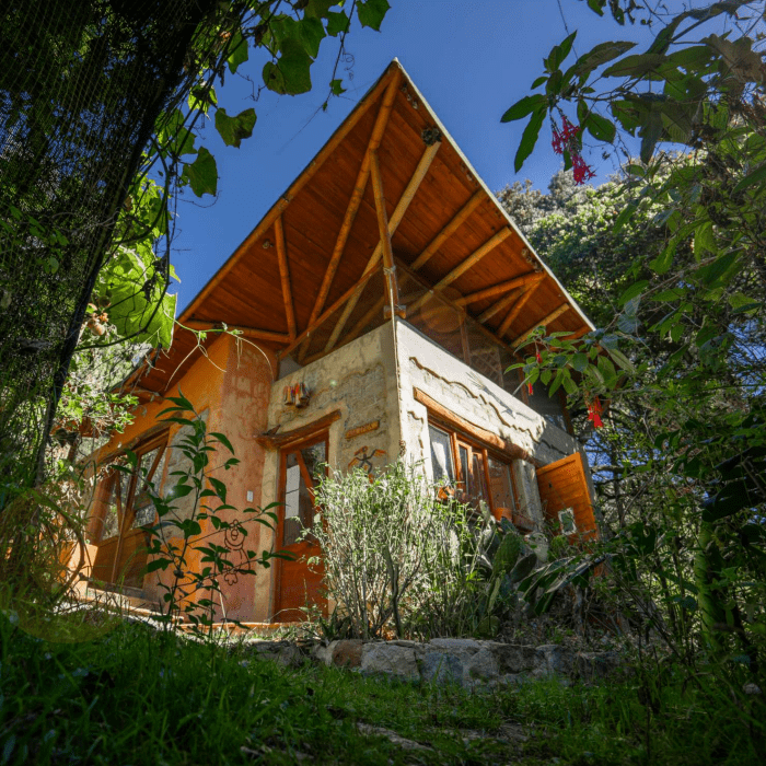 La Casa Chiboy es la casa de la vida. Está construida pegada a una roca de 20 metros de larga, de hace 100 millones de años. Construida con materiales naturales, guadua, barro y hongos, tiene una energía única. Somos pioneros en Colombia en construcción con hongos.